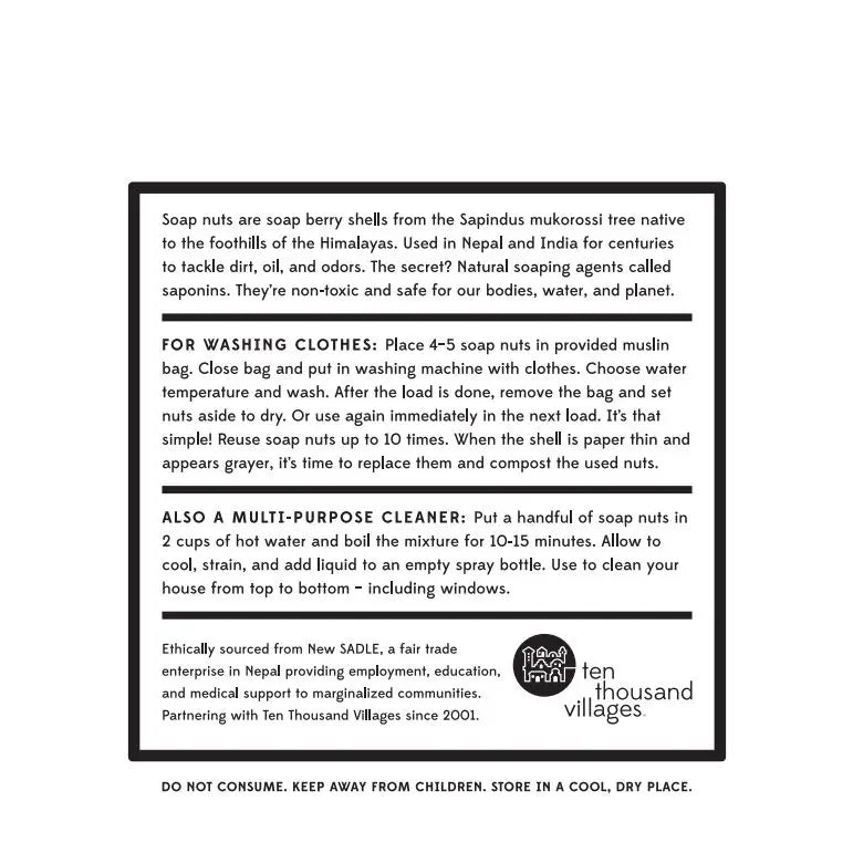 An eco-friendly alternative to laundry detergent, all-natural Laundry Soap Nuts. From the Sapindus Mukorossi tree, which is native to Nepal and India, come these naturally cleansing nuts. Simply use 2-3 nuts in a small cotton bag when washing with hot water and 4-5 nuts in cold water. Gentle on skin, great for baby clothes.
