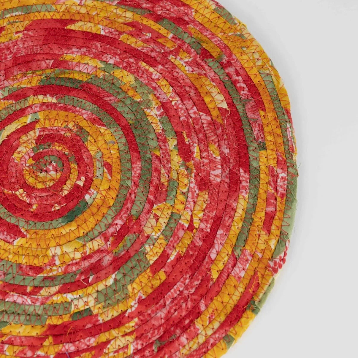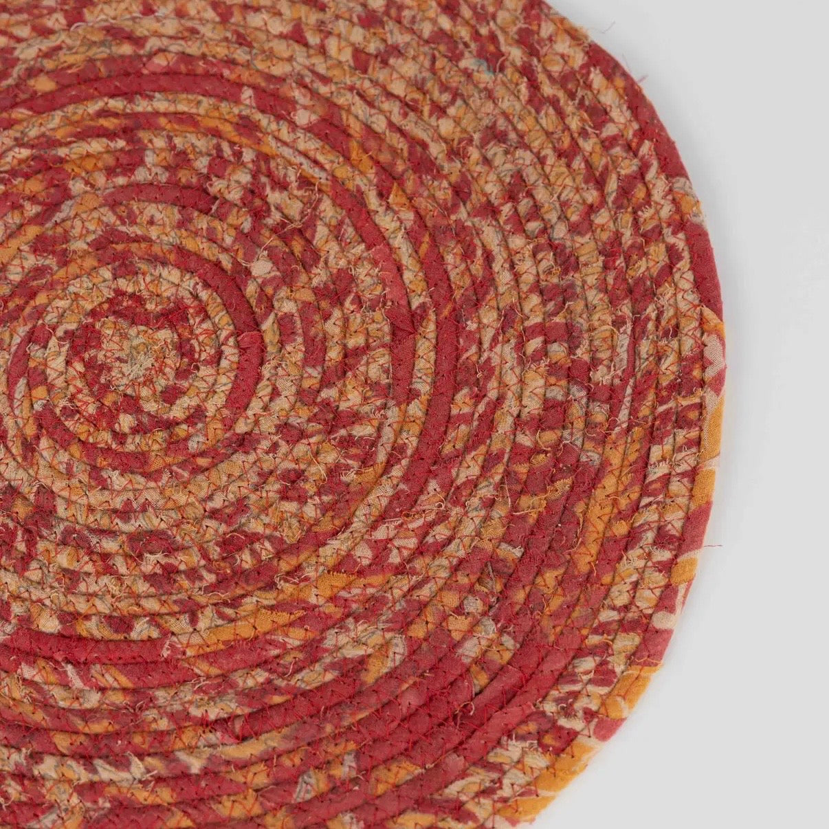 Recycled Sari Round Placemat makes a beautiful spot to rest your dinnerplate—add a bit of color for that delicious evening. Handmade with recycled cotton sari fabric by artisans with Prokritee, an organization that provides jobs and skills training for women in under-resourced communities in Bangladesh.