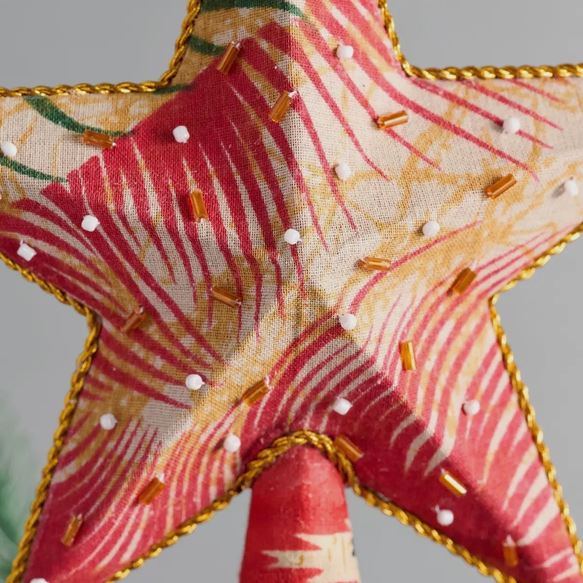 This gorgeously crafted topper is sure to be the star of your tree! With a cone base to ensure that placement's a snap, this piece is fashioned from assorted upcycled sari fabric covering sturdy cardboard. Quality embellishments like twisted thread edging and sewn-on beading add the perfect finishing touches. An enchanting piece that will bring joy year after year! Colors will vary. A Ten Thousand Villages Exclusive ethically handcrafted in Bangladesh by environmentalist artisans with Prokritee, an organization that provides jobs and skills training for women in under-resourced communities.